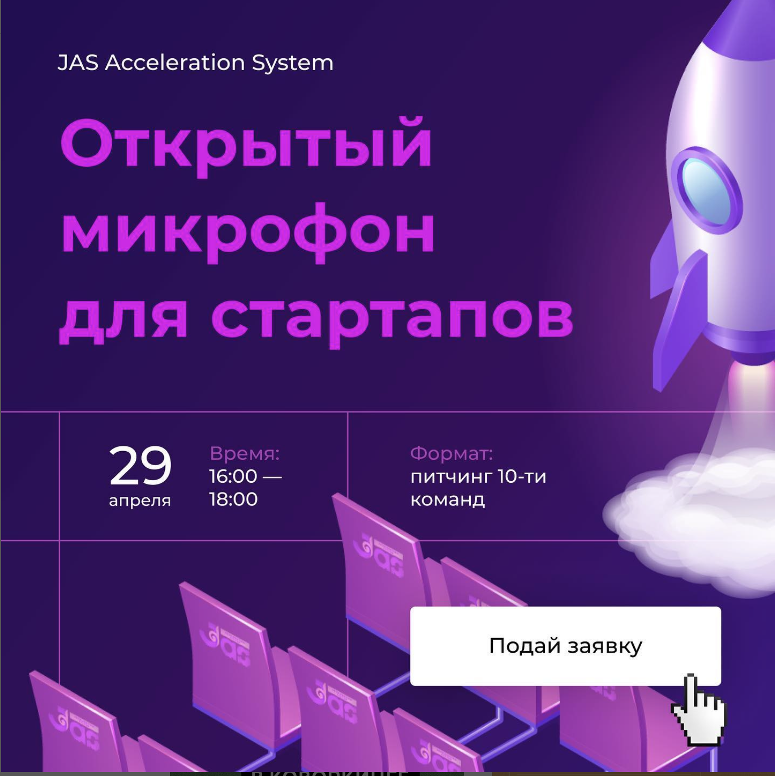 Dear friends! We are announcing the start of registration for an open microphone for startups! Every willing startup will be able to pitch their project in front of respected judges and win a subscription for 10 days in our coworking "JAS Coworking"! We will select 10 startups that we will allow to pitch. Judges:1. Magzum Tolesh - Co-founder Easytop.io2. Temirlan Berkimbayev - co-founder Voca.cc3. Daniyar Tenelov is a qualified coach4. Aigerim Abdenbaeva - Executive Director for Development of "JAS Ventures Almaty" Date: April 29 at 16:00? Location: Event Area in JAS Coworking (Seifullina...