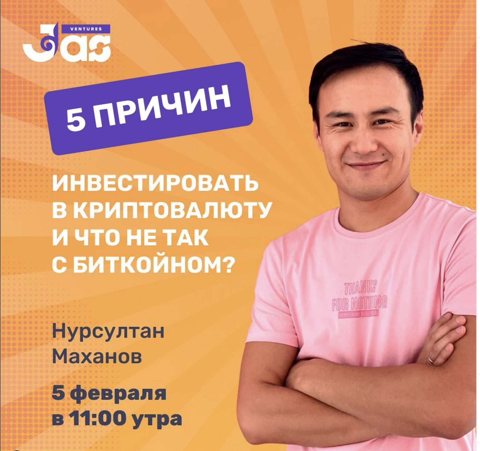 We are pleased to announce the launch of our educational workshops - JVA Workshops from JAS Ventures Almaty ? Workshop (“workshop" from English. "workshop") is a format of a training event that helps participants gain knowledge and immediately put it into practice to form certain skills. ? Our first speaker is Nursultan Makhanov with the topic "5 reasons to invest in cryptocurrencies and what's wrong with Bitcoin"Date: February 5Time: 11:00Format: online, Google meet? A little bit about our speaker:Nursultan is a PhD candidate of Nazarbayev University. Investigates Covid19 by applying computer...