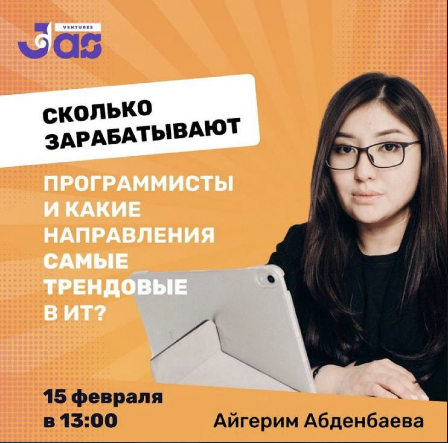 Мы продолжаем череду наших Семинары JVA от JAS Ventures Алматы ? ?Our next speaker is Aigerim Abdibaeva with the topic "How much do programmers earn and which areas are the most trending in IT?"Date: February 15Time: 13:00Format: online, Google meet? A little bit about our speaker:Aigerim is a PhD in Technical Sciences, Product Manager.She has a technical background, worked as a developer for 8 years in various foreign (USA, Singapore, India) and local projects.She has implemented more than 60 commercial projects, including her startup projects.She taught programming and higher mathematics...