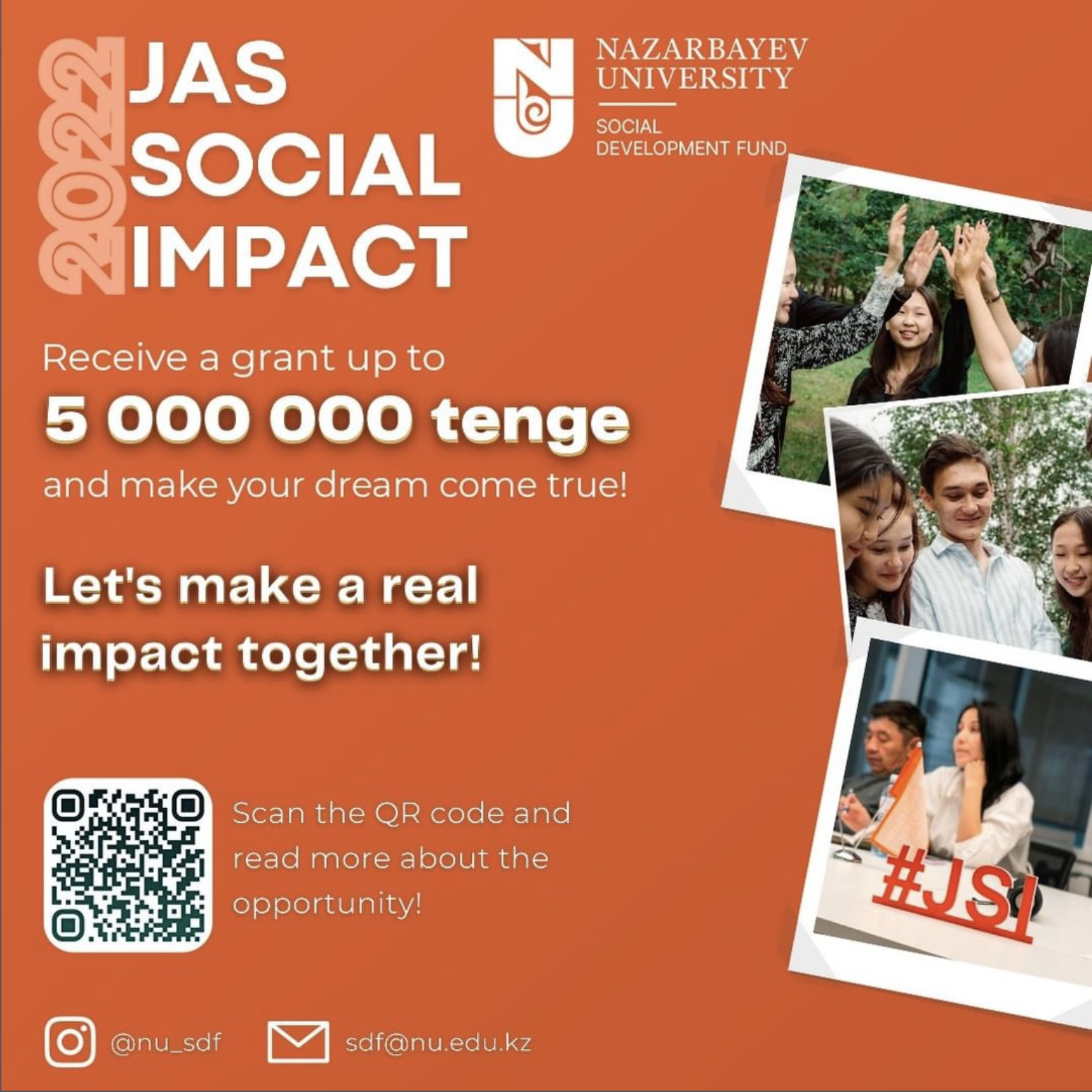 For those who have already thought about how to change the world for the better and are ready to present a social idea, a project, and perhaps even a tested pilot for its further development – this is your chance! Hurry up to apply and get a grant from the Social Development Fund up to 5,000,000 tenge for the realization of your dream! The Found is ready to support with financing:- Social projects (Social Project Grant)- Social Entrepreneurship Projects (Idea Grant, Start Grant, Impulse Grant) Participants can be any team with an applicant leader from:the community of Nazarbayev University...